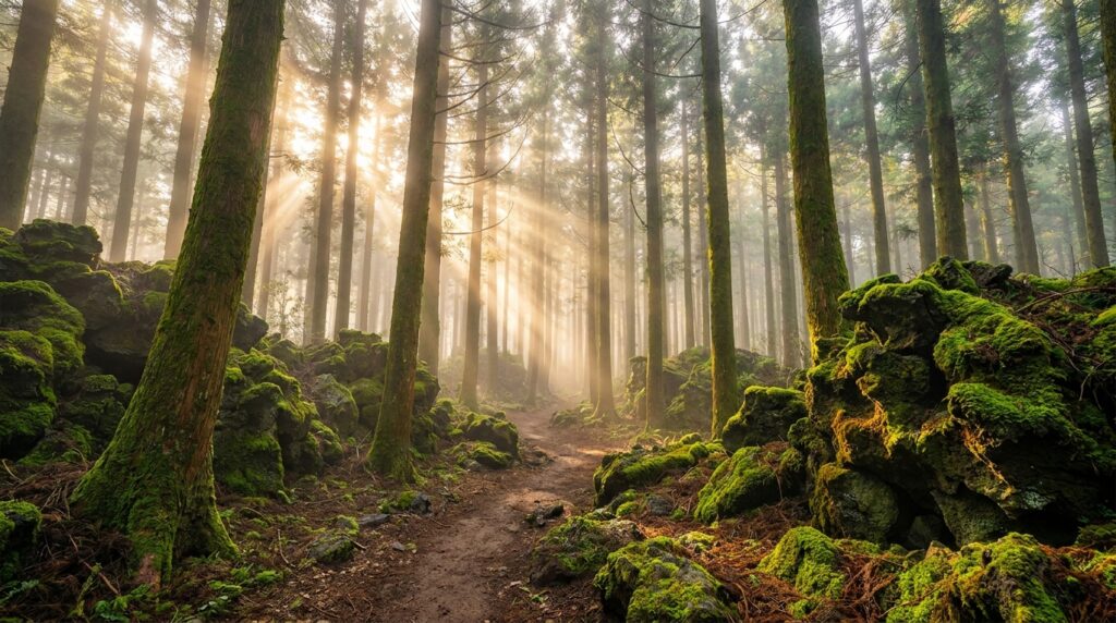 마지막으로 추천할 곳은 서귀포 호근동에 위치한 ‘치유의 숲’입니다. 해발 320~760m에 위치한 이곳은 난대림과 온대림이 교차하는 독특한 식생을 자랑합니다. 이곳의 핵심은 ‘멍 때리기’입니다. 숲 곳곳에 마련된 나무 침대에 누워 하늘을 가린 나뭇잎 사이로 구름이 흘러가는 것을 바라보는 것만으로도 충분합니다. 2026년부터는 숲 치유 프로그램이 더욱 세분화되어, 맨발 걷기 체험이나 숲속 명상 클래스에 참여할 수 있습니다. 사전 예약은 필수이며, 하루 방문객을 엄격히 제한하기 때문에 그 어떤 곳보다 정적인 휴식을 보장받을 수 있습니다.